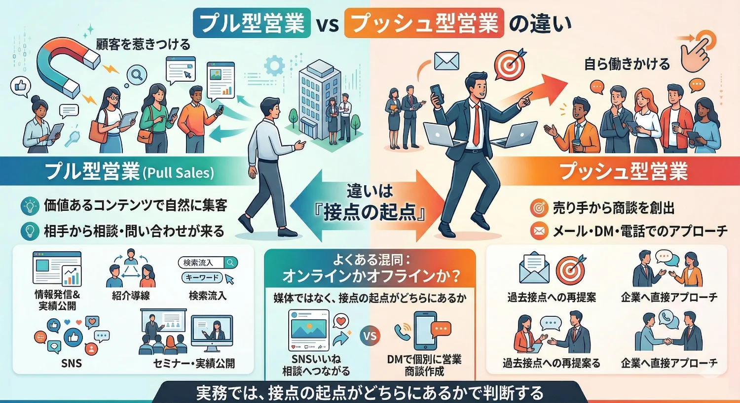 プル型営業とプッシュ型営業の違いは、接点の起点がどちらにあるかです。